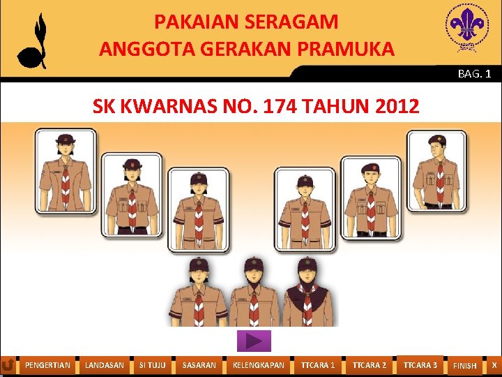 untuk "Nama Nama Kelengkapan Seragam Pramuka / Petunjuk Penyelenggaraan Pakaian Seragam Anggota Gerakan Pramuka - Topi pramuka atau baret 2."
