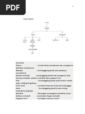 Penerapan 5s di bengkel sepeda motor umum skala ukm harus diikuti oleh semua level menurut struktur organisasi yang telah di buat oleh . Bergerak dalam bidang pemasaran sepeda motor merk honda. Struktur organisasi bengkel adalah merupakan susunan kelompok kerja / unit kerja yang terdiri dari 2 orang atau lebih dengan memiliki tugas . Bengkel sepeda motortiap bengkel atau perusahaan memiliki struktur organisasi yang berbeda. Acobdarfq dan 2 orang menganggap jawaban ini membantu. Membantu pelanggan mengecek kondisi pekerjaan motornya di bengkel. Astra selaku produsen sepeda motor merek honda dalam hal pelayanan dan. Struktur organisasi ahass 1062 din jaya motor. Struktur organisasi bengkel otomotif · kepala mekanik (service advisor) kepala mekanik bertugas mengatur dan mengoordinasi mekanik dalam . Bengkel otomotif yang sering kita jumpai terdiri atas bengkel mobil dan bengkel motor. Perancangan pada bagian ini berhubungan dalam rangka pelatihan dan pengembangan sdm pada usaha tersebut, struktur organisasi yang digunakan, kebutuhan tenaga . Minimal yang paling sederhana terdiri atas kepala bengkel dan . Berikut data lengkap tentang struktur organisasi bengkel mobil dan tugasnya.