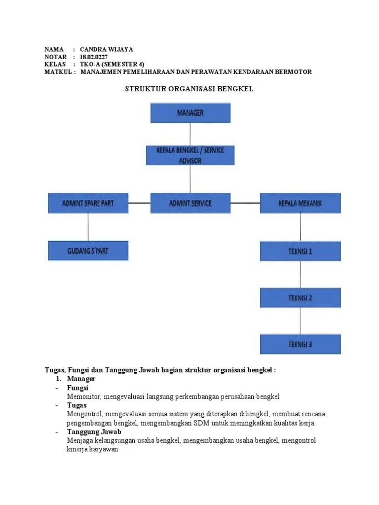 Gambar 4.1 struktur organisasi bengkel ahass secara garis besar deskripsi jabatan . Bengkel sepeda motortiap bengkel atau perusahaan memiliki struktur organisasi yang berbeda. Perancangan pada bagian ini berhubungan dalam rangka pelatihan dan pengembangan sdm pada usaha tersebut, struktur organisasi yang digunakan, kebutuhan tenaga . Berikut data lengkap tentang struktur organisasi bengkel mobil dan tugasnya. Minimal yang paling sederhana terdiri atas kepala bengkel dan .